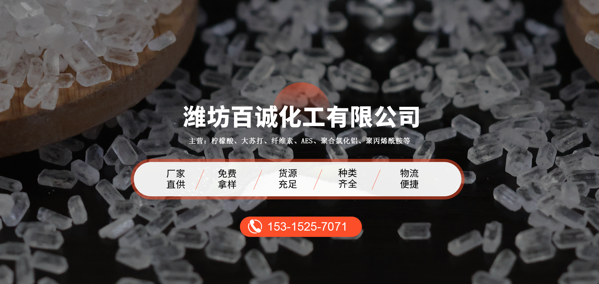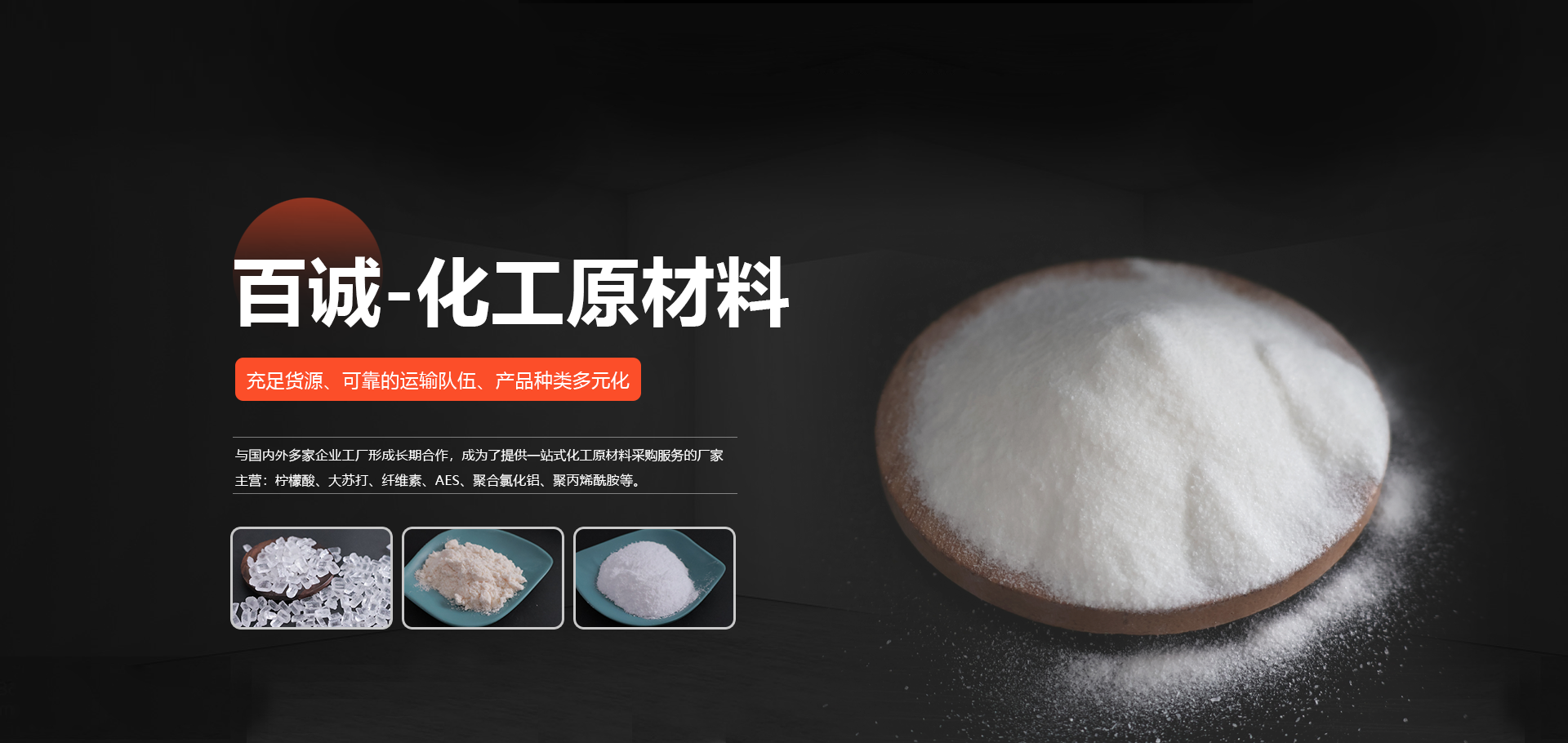 成立于山東的濰坊百誠化工有限公司多年來與國內(nèi)外多家企業(yè)工廠 形成長期合作,形成了競爭力的化工原材料供應(yīng)、銷售和服務(wù) 渠道,主營:大蘇打、葡萄糖、檸檬酸、纖維素、消泡劑、AES等。